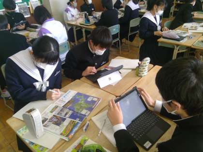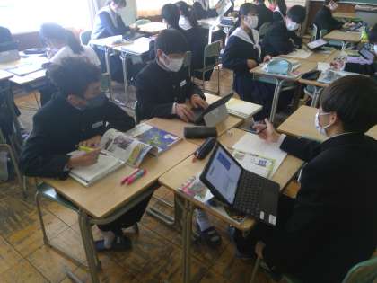 月曜日の1時間目、週の始まりの授業の様子です。朝から2年3組の教室では活発に意見交換をし、グループでの学びを楽しむ生徒の姿がありました。ここのところ授業でより意欲的に取り組む姿が目立つ3組の生徒たち、学年末テストにむけてやる気いっぱいです!