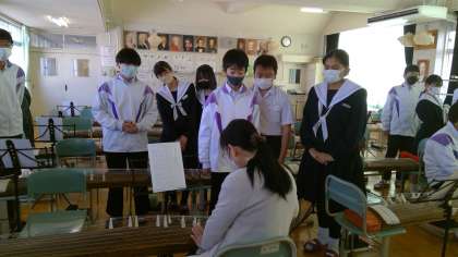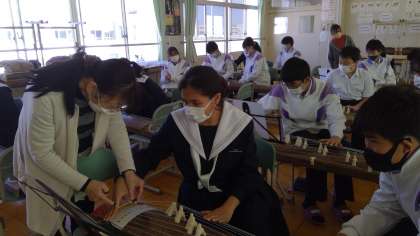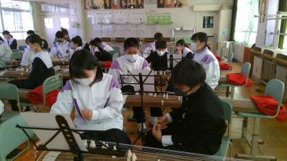 3学期の音楽の授業では「日本の音楽」を学習しています。今週は、箏の先生にお願いをして箏について学習をします。道具の名前や使い方、楽譜の見方など、丁寧に教えて頂きました。その後「さくらさくら」の演奏に挑戦しました。隣の人と助け合いながら、段々と演奏出来るようになりました。日本文化に触れることが出来た貴重な一時間になりました。