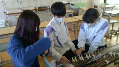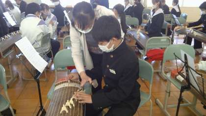 真剣な表情で、箏に向かっています。講師の方のアドバイスを受けながら、座る角度や力の入れ方に注意しながら演奏をすることができていました。