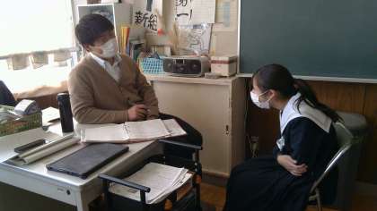 学年末テストに向けての教育相談が行われました。生活面・学習面・人間関係などでの心配事を担任の先生と共有し、話し合っていきました。また、学年末テストの目標や、二年生に向けて頑張ることなどを明確にし、自分のモチベーションへと繋げようとする生徒の姿も見られました。