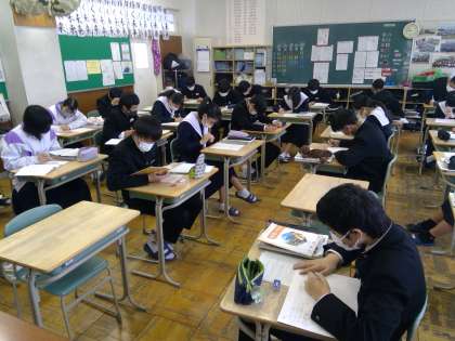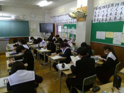 テスト週間に入り、授業の中でも対策プリントなどの取り組みを行っています。テスト直前の教室は静寂な空気の中で真剣に取り組む生徒たちの姿が見られました。テストまであと2日最後まであきらめずに頑張って勉強しましょう!