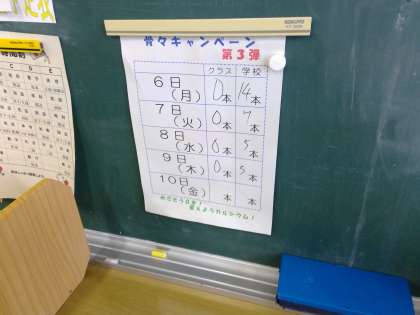 第3回の「骨々キャンペーン」も無事終わりました。2年生はこれまで全クラス1本も残らず牛乳を飲みきることができました。風邪や体調不良などで欠席者が増えて牛乳が余ってもクラスみんなで飲み切ってしまう2年生、毎日1本も残らず牛乳を飲んで元気に頑張っています。毎日お昼の給食の時間に給食委員の生徒からの熱いメッセージが全校生徒に呼びかけられていました。給食委員のみなさん一週間お疲れさまでした。教室の背面黒板には牛乳残り0本と記された表が掲示されています。