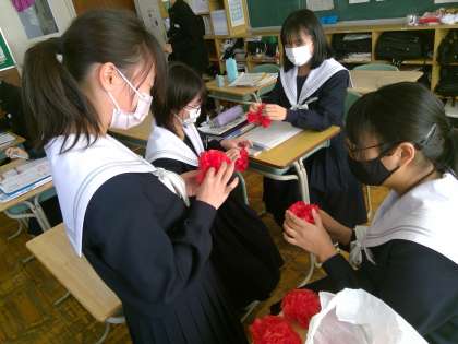 テスト勉強の合間に教室では花飾りを楽しそうにつくっている生徒たちがいました。何気ない会話を楽しみながら、笑顔で作業に取り組む生徒たちでした。