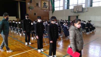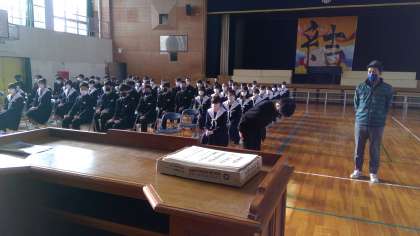 体育館で卒業証書を受け取る練習をしました。第1回目の練習ということで、動きのぎこちなさや返事の声が気になりました。明日も証書を受け取る練習があります。気持ちのこもった動きや返事を期待しています。