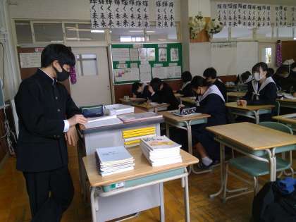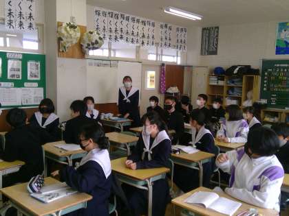 テストを終えて帰りの短級では、学級委員や日直の生徒から今日一日をふり返り、そして明日以降にむけて「こんなことを頑張ろう」と前向きな呼びかけがクラスみんなにされていました。笑顔いっぱいの明るい2年4組の短級でした。