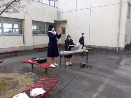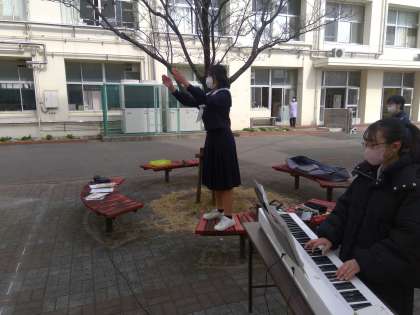 中庭での練習では、声がなかなか響きませんでしたが、歌いやすいように曲のテンポを工夫する伴奏者、そして全体を見て気づいたことを伝え、合唱をよりよくしようと指揮者の生徒の苦労は続きます。大変ですが、みんなで最高の合唱を作り上げることができたとき、きっとこの上ない達成感を味わうことができるはず、みんなで頑張っていきましょう!
