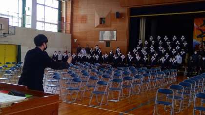 全パートがそろっての練習は今日が初めてでした。合唱が初めてとは思えないほど、きれいな歌声を体育館に響かせていました。