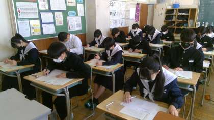 明日はいよいよ公立高校一般入試当日です。予想問題に取り組んでいました。今までの努力の成果が発揮されることを期待しています。