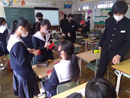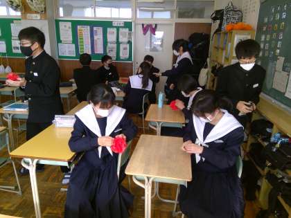 教室では休み時間、給食後のちょっとした時間にどのクラスも花飾りの制作に力が入ります。みんなで輪になって話しながらの作業はとても楽しそうです。見ていて温かい気持ちになります。