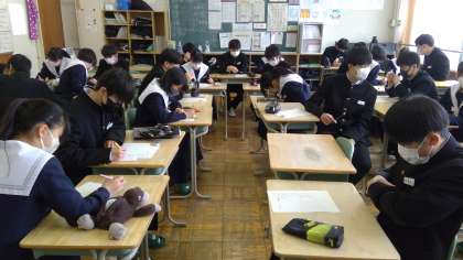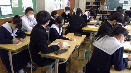 各クラスの学級の時間には「私の歴史」と題したプリントを記入していました。小学生だった頃や中学生時代の自分を振り返り、二十歳になった自分を想像して記入していきます。成人式の日に、そのプリントを読み返してみるのもよいですね。