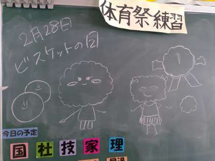 2年1組の教室の様子です。学級委員が製作した掲示物、残り少ない3学期の生活をよりよいものにしていけるように工夫が見られます。その気持ちに応えて頑張ってほしいものですね。背面黒板には、見ていてほっこりするようなイラストが描かれていました。今日は何の日か。背面黒板を見るのが楽しみになります。