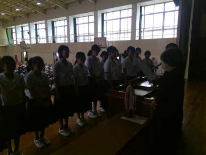 春の大会で多くの部活動が好成績を残すことができました。表彰披露となった全校集会、体育館のステージで堂々とした態度で、校長先生から賞状を受け取り「ありがとうございました。」と嬉しそうに会釈する生徒たちの笑顔が印象的でした。