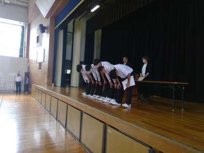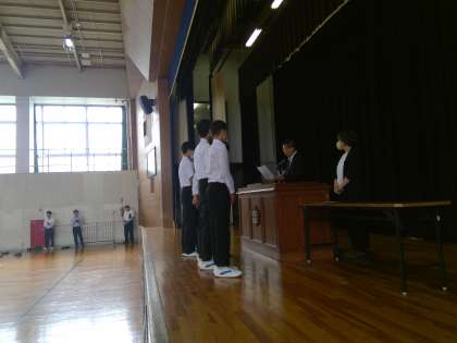 大きな声で「はい」と返事をする生徒たち、「ありがとうございました。」と気持ちのよい声でステージ上で全校生徒にむけてあいさつをする3年生の姿にたのもしさを感じました。素晴らしい活躍、そしてその姿、最後の夏の大会にむけてこれから頑張っていってほしいです。