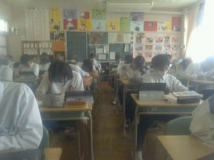 本日の5時間目、2年1組は新聞づくりをしています。落ち着いた雰囲気の中、みんな黙々と新聞をつくっています。