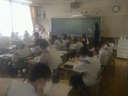 本日の5時間目、2年2組と3組は英語です。真剣に先生の説明を聴く姿は立派です。テストに向けファイト!