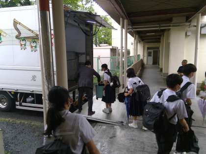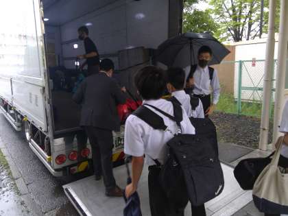 明日の修学旅行にむけて、朝から大荷物をトラックに積み込む3年生の生徒たちでした。いつもより早い時間でしたが、早くから登校し、大荷物にタグをつけ、送り状などの確認もばっちりです!