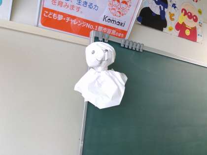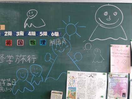 修学旅行を明日にむかえた3年生の教室には、背面黒板に描かれたてるてる坊主と、子どもたちが作った大きなてるてる坊主が飾られていました。明日からの3日間天気が心配されますが、生徒たちの想いが天に届いてくれることを願っています。3日間晴れるといいですね。
