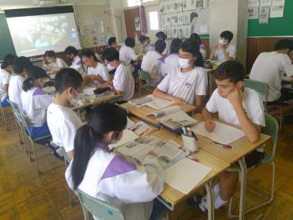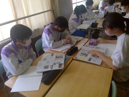 社会の授業では、第二次世界大戦前の世界の様子について学習しています。戦争に関わることをじっくり考え、資料を使って話し合うなど、学習意欲の高さがうかがわれる生徒たちの様子でした。