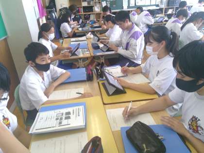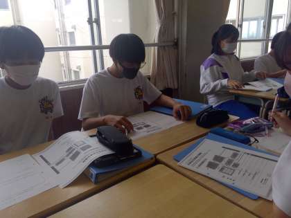 3年生の進路学習では、それぞれが将来の目標について考え、そこに到達するまでの過程の中で希望する高校や大学など、進学について考え合いました。グループで話し合う中で、学校についての興味・関心が深まっていく生徒たちの様子が印象的でした。