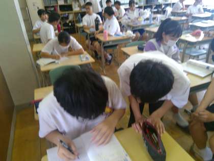 給食を食べ終わってすぐに学習に取り組む生徒たち、難しい問題については教え合っている様子でした。テスト週間に入ってからこれまで以上に学習の意欲が高く感じられる生徒たちでした。