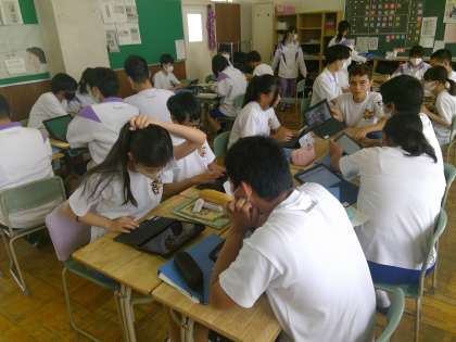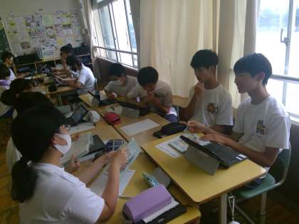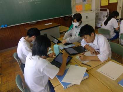修学旅行で学んできたことをふり返り、班ごとにプレゼン作成に取り組む3年生の生徒たち。活動している様子はじつに楽しそうに笑顔いっぱいでした。