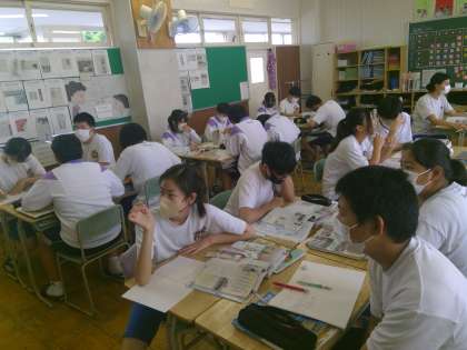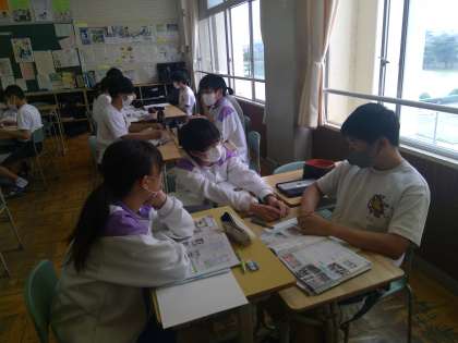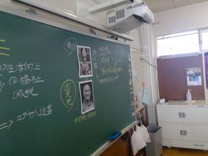 テスト前の授業、難しい内容を理解しようと黒板に記された写真や言葉を自分たちで解釈しようとグループで話し合う生徒たち。一生懸命な姿勢がとてもいいですね。
