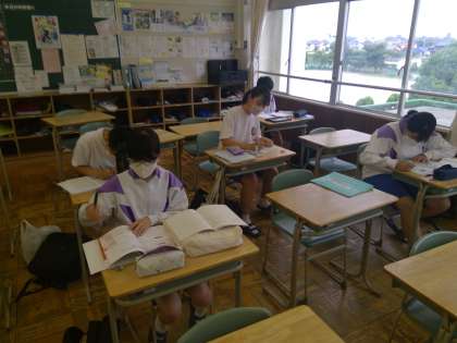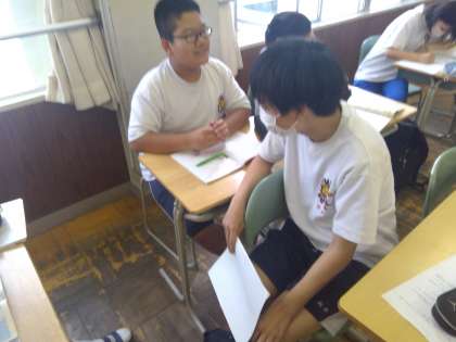 授業後の教室は、教育相談を待ち、学習に取り組む生徒たちでにぎわっていました。数学の問題や理科の化学式の理解をはかろうと友達に聞きあう生徒たち、悪戦苦闘しながらも頑張っている様子でした。