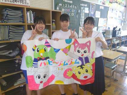 3年3組の学級目標が完成し、教室壁面に掲示されました!中心となって制作にあたってくれた生徒たちと記念撮影!嬉しそうな笑顔が印象的でした!学級目標「ハッピージャムジャム」どんな意味がこめられているのでしょうか?