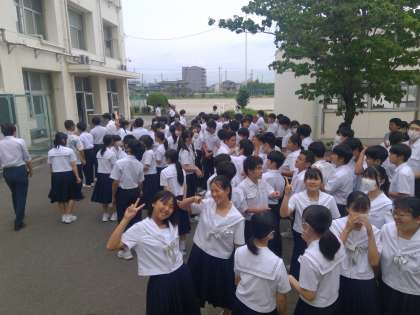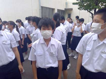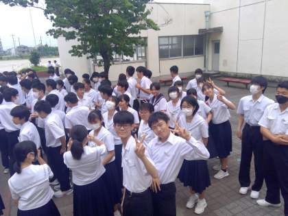 テスト終了後、3年生は学年写真を撮影しました!中庭での撮影、3階からカメラマンさんの合図で撮影しました。撮影前に笑顔の練習を!1日目のテストが終わってほっと一息笑顔がこぼれていました。