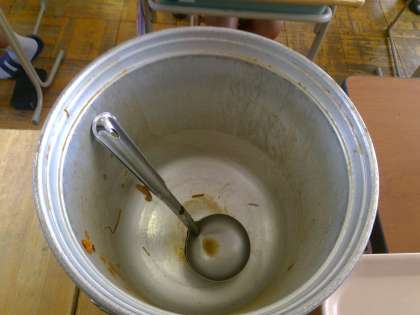 月曜日の給食、おかわりに並ぶ生徒たち、暑さが厳しくなってきましたが食欲旺盛な3年生でした。今日も食缶の中はこのとおり!!完食です!