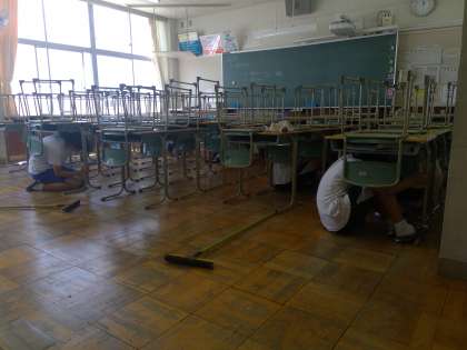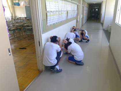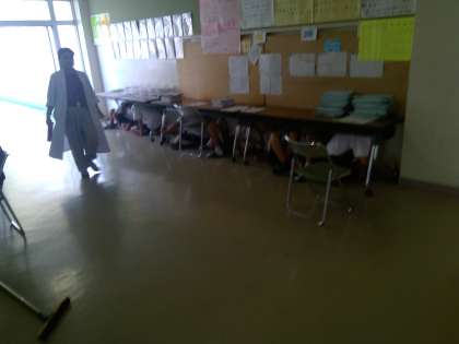 給食が終わって清掃に移動する際に流れた緊急放送、シェイクアウト訓練が行われました。緊急放送での訓練に対しても、すぐさま行動にうつせる3年生、さすがの対応でした。廊下や教室、学年のロビーではそれぞれが考えて頭を隠し、対応できました。