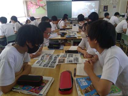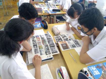 3年生の社会の授業では、高度経済成長期の日本ついて資料を使って話し合いました。当時の人々の様子に目を輝かせて資料をじっくり見合っている生徒たちの様子がとても印象的でした。