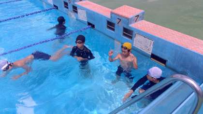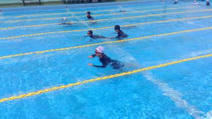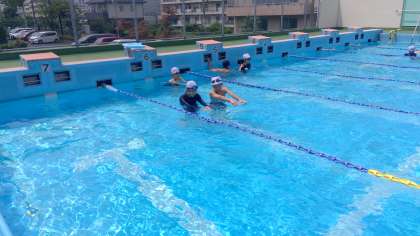 本日の授業では25m自由形の計測を行いました。計測に備えて、互いに泳ぎ方を見あったりアドバイスしたりする姿が見られました。