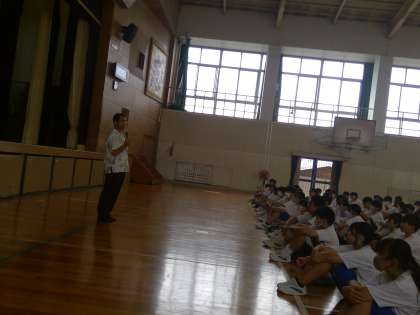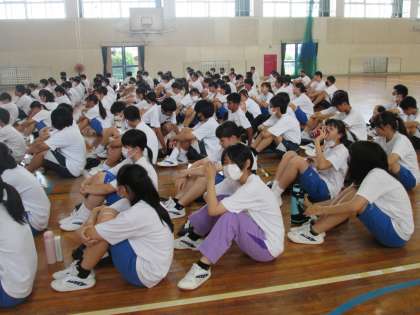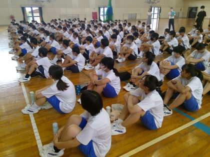 学年集会では、学習担当や進路担当の先生からの話がありました。話題の中心は受験勉強に関するものでした。暑さが厳しい中の学年集会でしたが、給水しながら集中力を切らさず、真剣に話を聞く生徒たちでした。