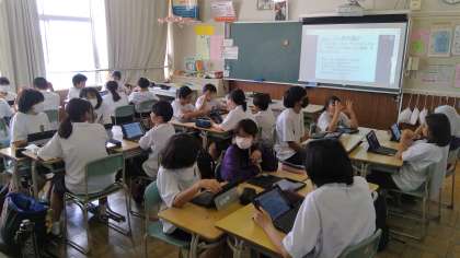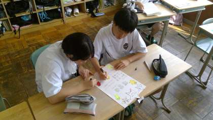 本日18日の学年集会の後は、学級ごとに学活を行いました。写真は係の掲示物を作る1年1組と、学びの3箇条決めの続きをやる1年2組。