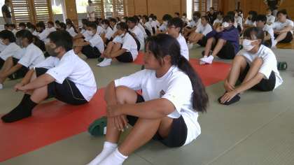 本日6限に、1学期締めの学年集会が武道場にて行われました。入学してから、はや3ヶ月。数々の行事を経て、成長した成果が、チャイムスタートに現れていました。