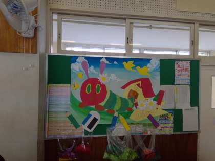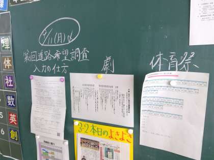 教室の背面黒板には、それぞれ連絡事項が掲示されています。また、学級目標の掲示物や花などの植物が置かれている教室もあります。教室環境が豊かだと子どもたちの生活も潤うように感じる今日この頃です。