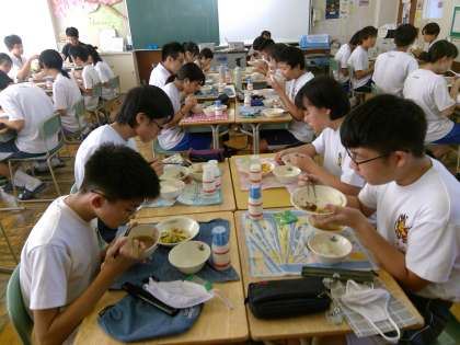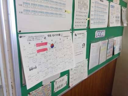 2学期が始まってもうすぐ一週間になります。どのクラスも当番や係の取り組みがよく、テキパキ行動しているので、ゆっくりと給食を食べる時間がもたれています。どのクラスもほぼ完食!!完食した日は給食の献立表に国旗を記しているのは3組の教室、ちょっとしたことですが励みになります!