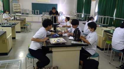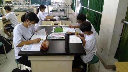 写真は、授業後に自主的に残って学習している生徒たちの様子です。