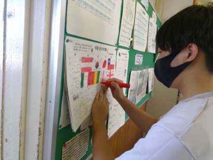 帰りの短級を終えてみんなが教室を出る時に、給食の献立表に何やら書き込む3組の生徒がいました。給食を完食できたので献立表にいつもの万国旗を描いているようでした。食欲旺盛な3組、ほぼ毎日給食完食を達成させています!