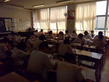 昼休み教室をのぞいてみると、休み時間とは思えない静寂な教室でした。全員が自分の席に座って黙々と勉強に励んでいた1組の教室でした。テストまであと数日、気合い十分ですね!