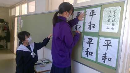 委員会ごとに分担をして文化祭の準備を行いました。図書委員会と給食委員会の生徒が、書写競技会の作品を展示する仕事を行いました。