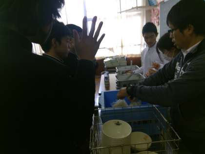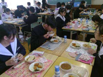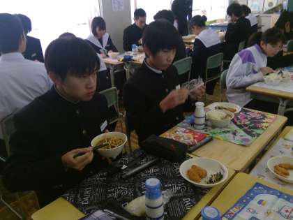 3学期はじめての給食、久しぶりの給食の時間を楽しく談笑しながら食べる3年生の生徒たちでした!あいかわらず食欲も旺盛でした!