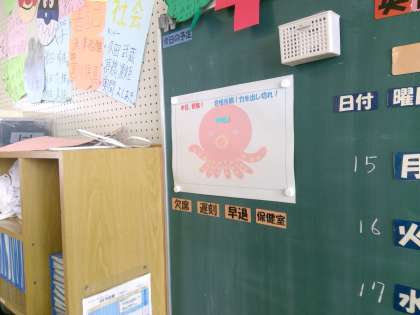 環境委員によるアルミ缶回収を呼びかけるポスターが掲示されていました。3学期が始まったばかりですが、それぞれの教室を見ると掲示物で訴えかけるものがいくつか見られました。