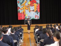突然のゲリラ豪雨で渡り廊下に雨水が入り、床がびしょ濡れになってしまいました。給食の時間にもかかわらず、2年4組の生徒たちが自主的に拭き掃除をしてくれました。