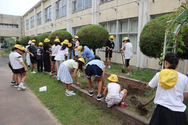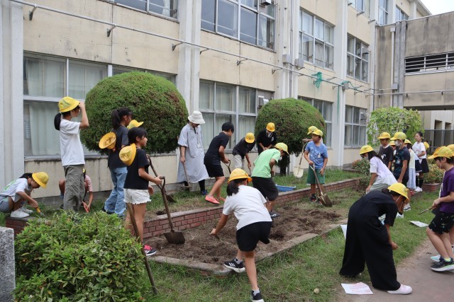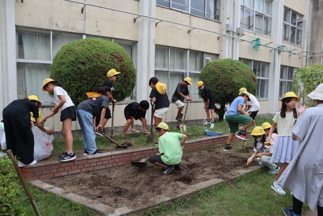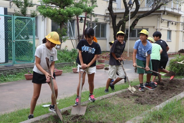あいた花壇に川をつくり、水の流れを調べます。まずは山と川を一生懸命作っています。実験が楽しみですね。
