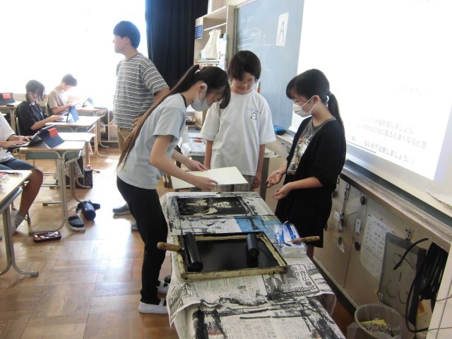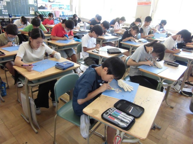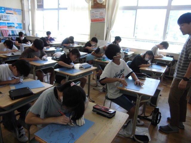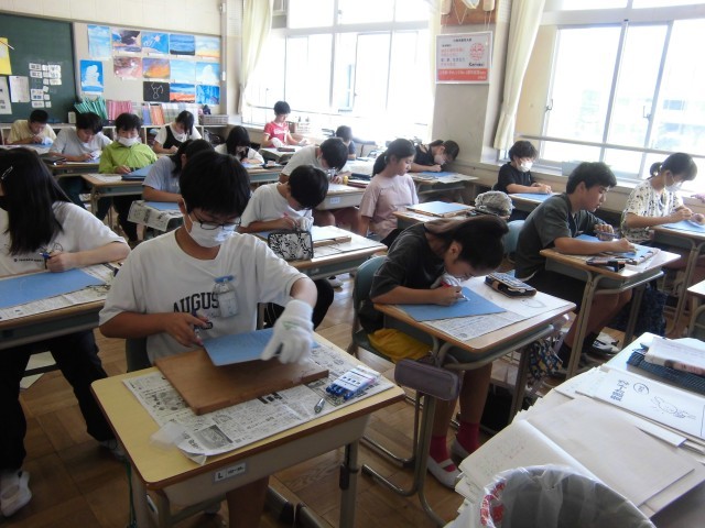 版画作品を作ります。彫刻刀を使うので、みんな真剣に、慎重に、作品づくりをしています。