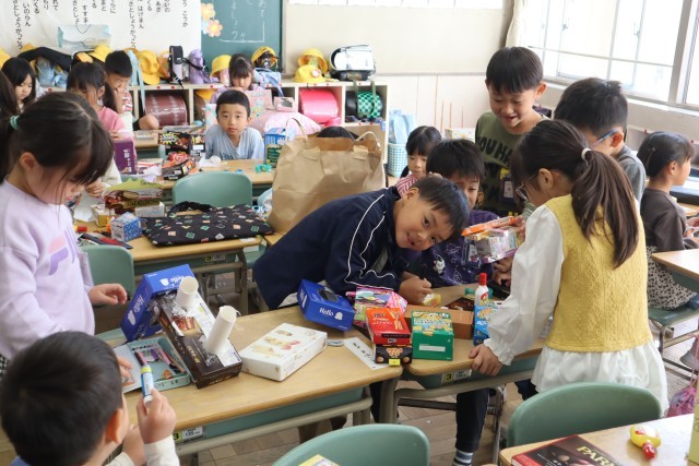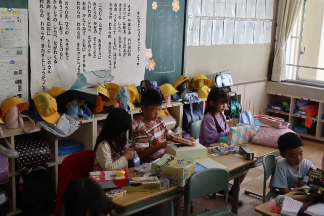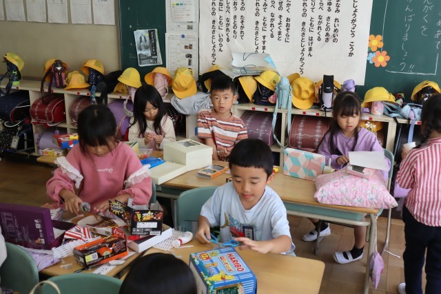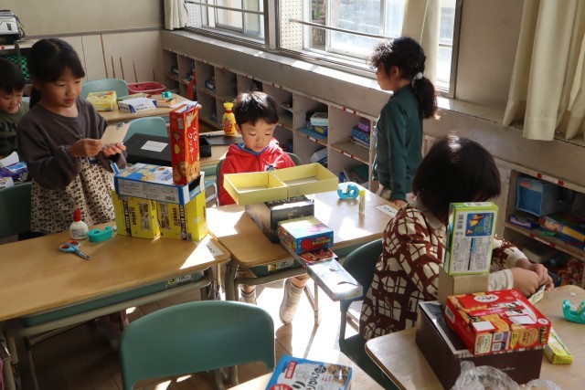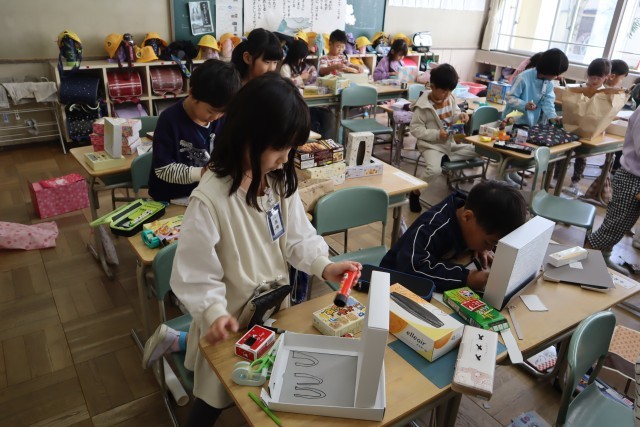 元々の箱の形を生かし、自分が作りたいものに仕上げていきます。マイクや車など、箱の形を生かして楽しい作品がたくさんできあがりました。
