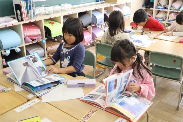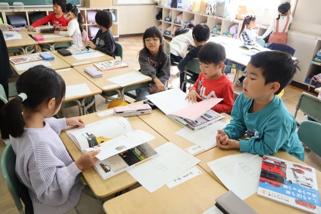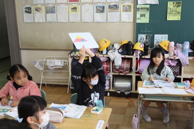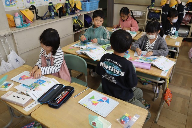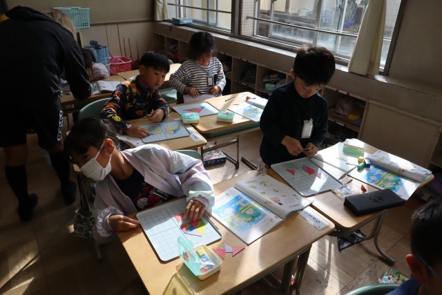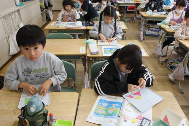 1年生は1組は働く車を調べて、プリントにまとめていました。2組は三角形を組み合わせて、いろいろな形を作っていました。