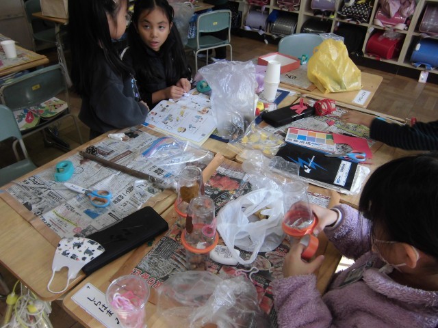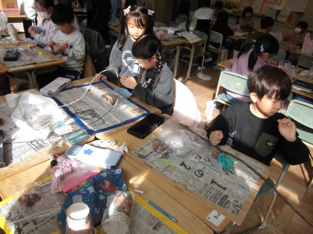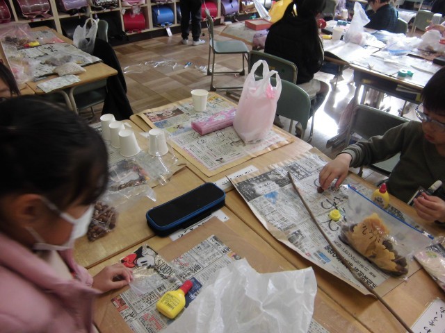 どんぐりやまつぼっくりなどを使って、秋のおもちゃづくりをしました。